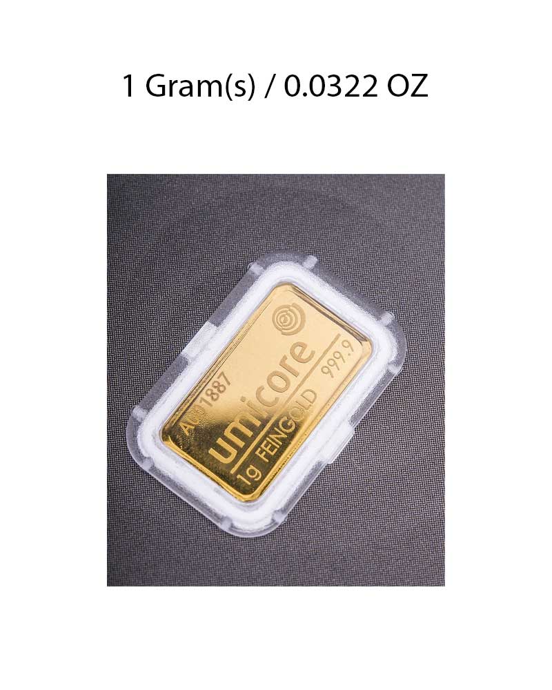 1 gram Umicore 999.9 fine gold bar with assay card.