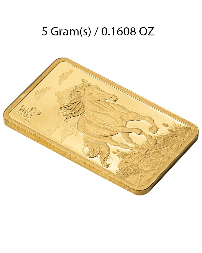 The 2026 Year of the Horse 5g gold bar from PAMP. These bars are a popular choice for gifting and with collectors of the PAMP lunar series.