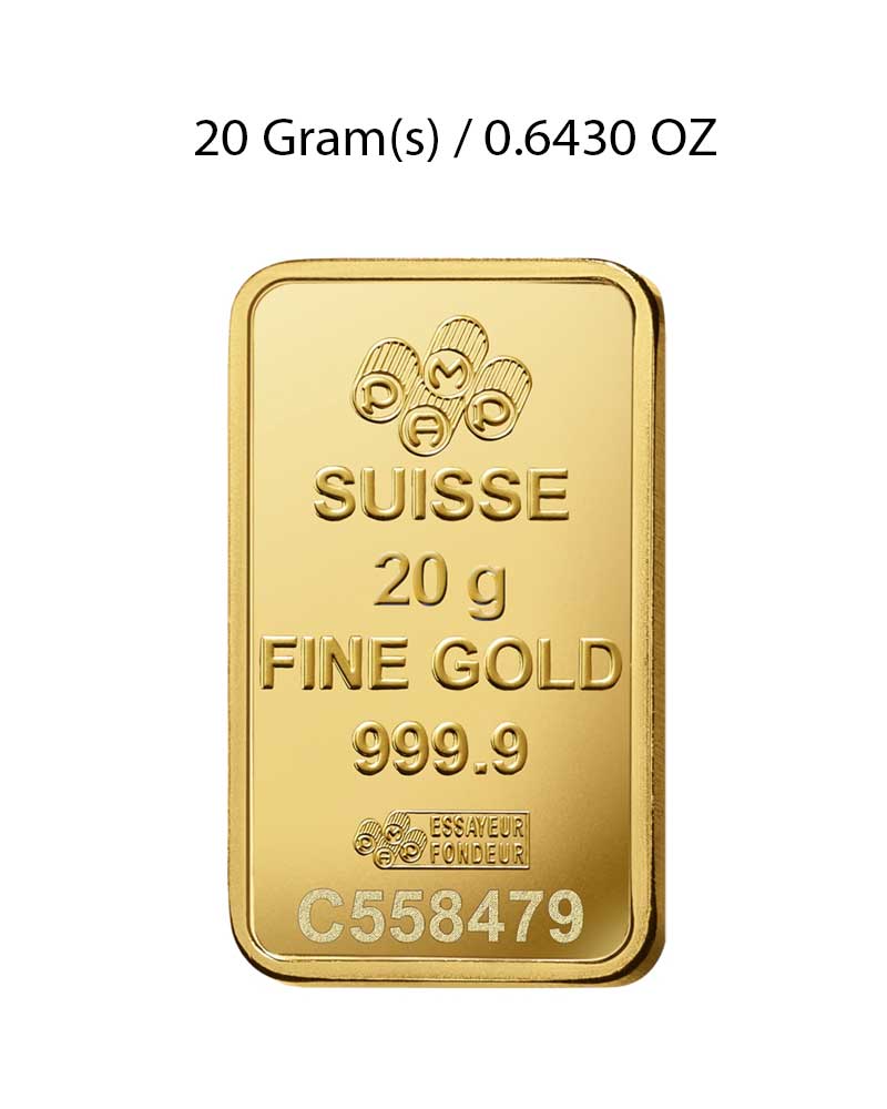 The PAMP 20g gold bar is a minted gold bar made from 999.9 fine 24-carat gold bullion. The new gold bar has a unique serial number with a built-in assay card verifying the weight and purity of the gold.