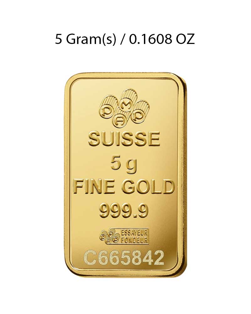 The PAMP 5g gold bar is a minted gold bar made from 999.9 fine 24-carat gold bullion. The new gold bar has an individual serial number with an assay card confirming the investment gold content.