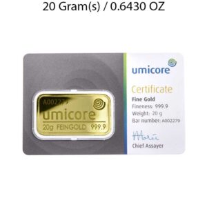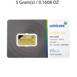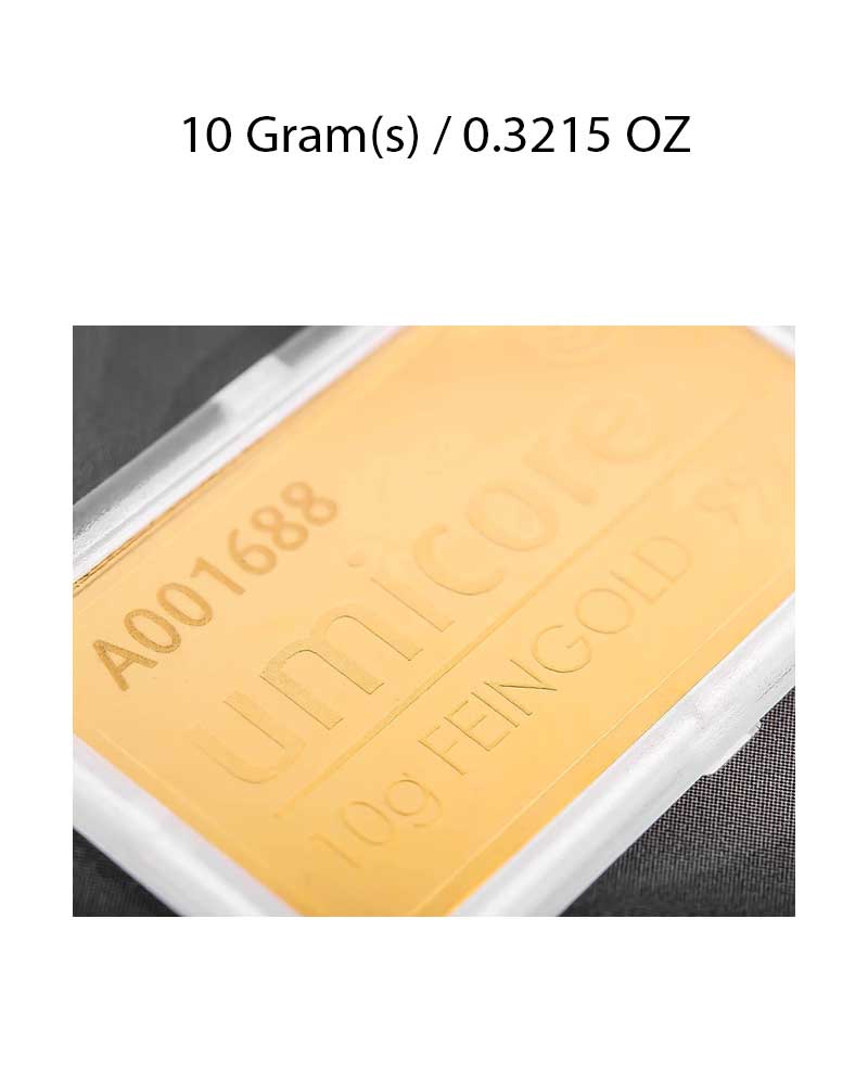 10g investment-grade gold bar from Umicore, manufactured to 999.9 fine gold. Supplied in secure packaging with full assay details, ideal for building or diversifying your physical gold portfolio.