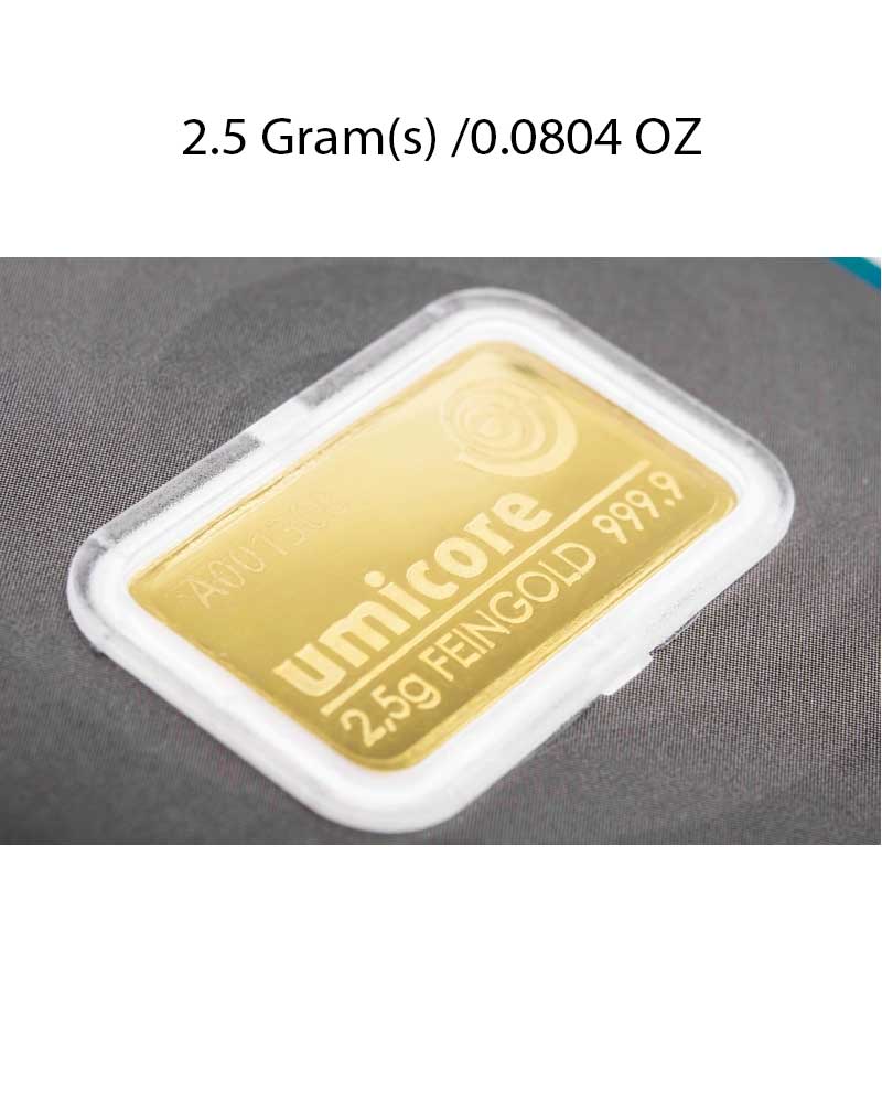2.5g Umicore 999.9 fine gold bar.