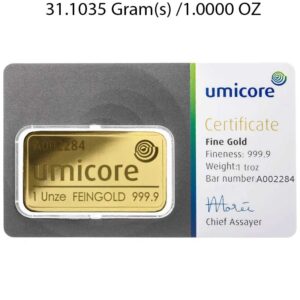 500g investment-grade gold bar from Umicore, manufactured to 999.9 fine gold. Supplied in secure packaging with full assay details, ideal for building or diversifying your physical gold portfolio.