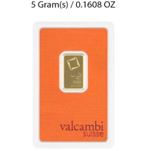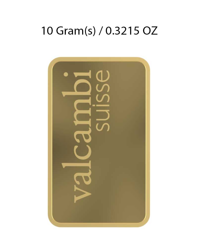 10g investment-grade gold bar from Valcambi, manufactured to 999.9 fine gold. Supplied in secure packaging with full assay details, ideal for building or diversifying your physical gold portfolio.