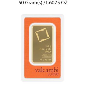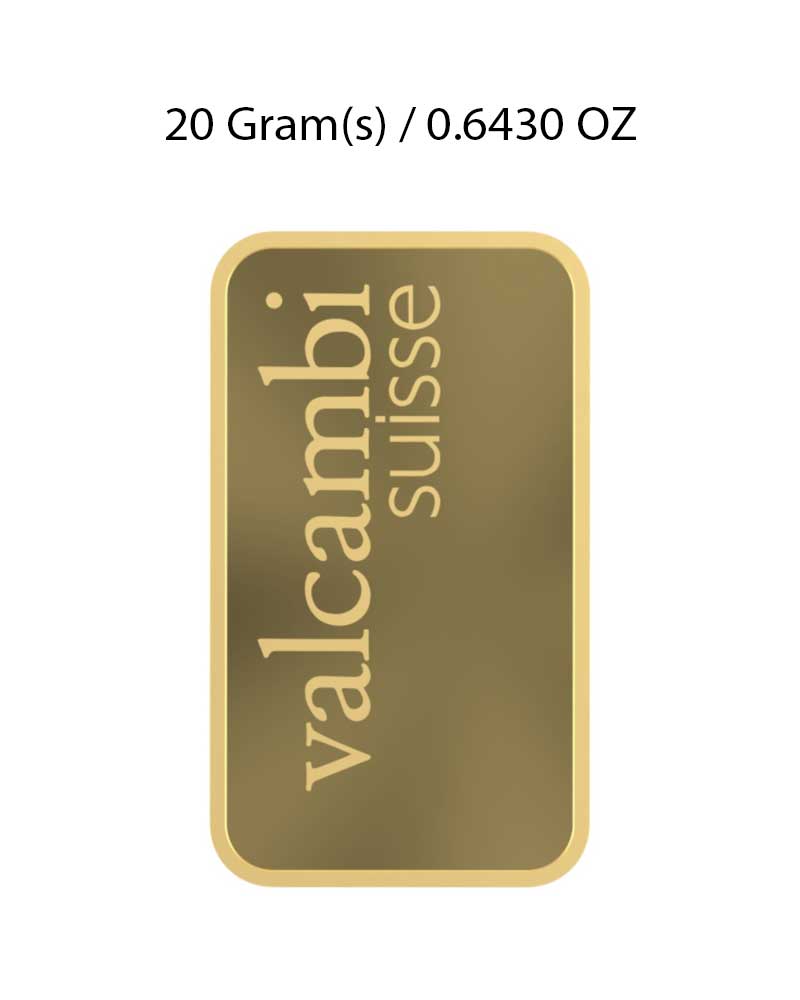 20g investment-grade gold bar from Valcambi, manufactured to 999.9 fine gold. Supplied in secure packaging with full assay details, ideal for building or diversifying your physical gold portfolio.